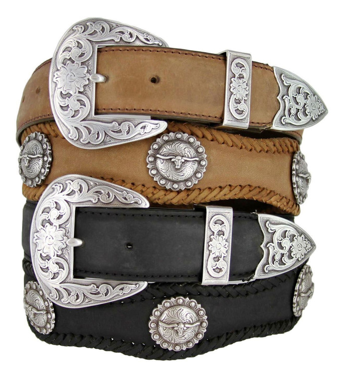 Silver Laredo Longhorn Steer Conchos Crazy Horse Scalloped Genuine Leather Western Belt 1-1/2"(38mm) Wide
